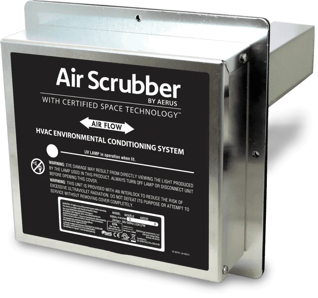 The Air Scrubber by Aerus installs directly into residential or commercial HVAC systems to remove surface and airborne contaminants including VOCs, odors, dust, pet dander, and other allergens. The system uses our proprietary ActivePure® Technology and has been tested in independent labs and proven effective on bacteria, viruses, mold and fungi on surfaces and in the air.